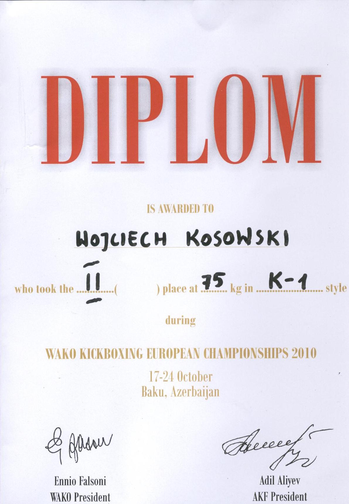 W dniach 18-24 października 2010 w Baku (Azejberdżan) odbyły się Mistrzostwa Europy prestiżowej organizacji WAKO. Zawody rozgrywane były w trzech formułach walki: K-1 rules, kickboxing low-kick i kickboxing light-contact. Mistrzostwa odbywają się co dwa lata. Wzięło w nich udział 427 zawodników, a w K-1 rules 130 z krajów całej Europy. Polska reprezentacja liczyła 29 osób, do K-1 zgłoszonych zostało 10. Poziom Mistrzostw był bardzo wysoki, spotkali się tam najlepsi zawodnicy z całej Europy.