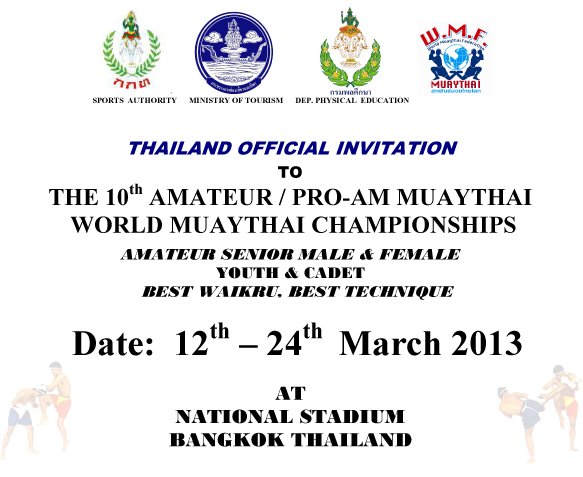 W dniach 12-24 marca w Bangkoku, w Tajlandii odbędą się Mistrzostwa Świata Muay Thai WMF 2013, w których będę walczył.