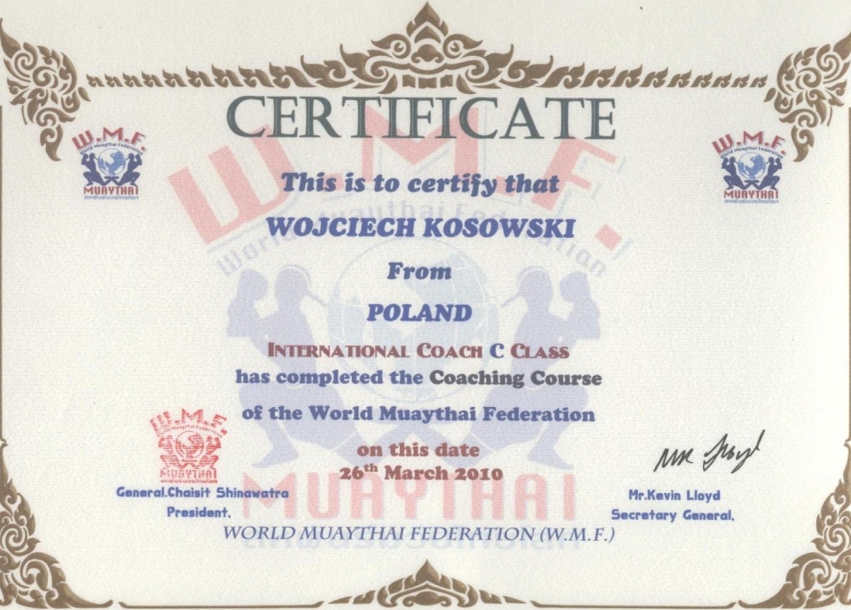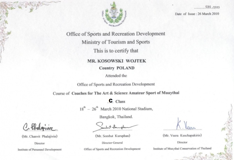 Międzynarodowy Trener Muay Thai klasy C (wydane przez Tajlandzkie Ministerstwo Turystyki i Sportu oraz Word Muay Thai)