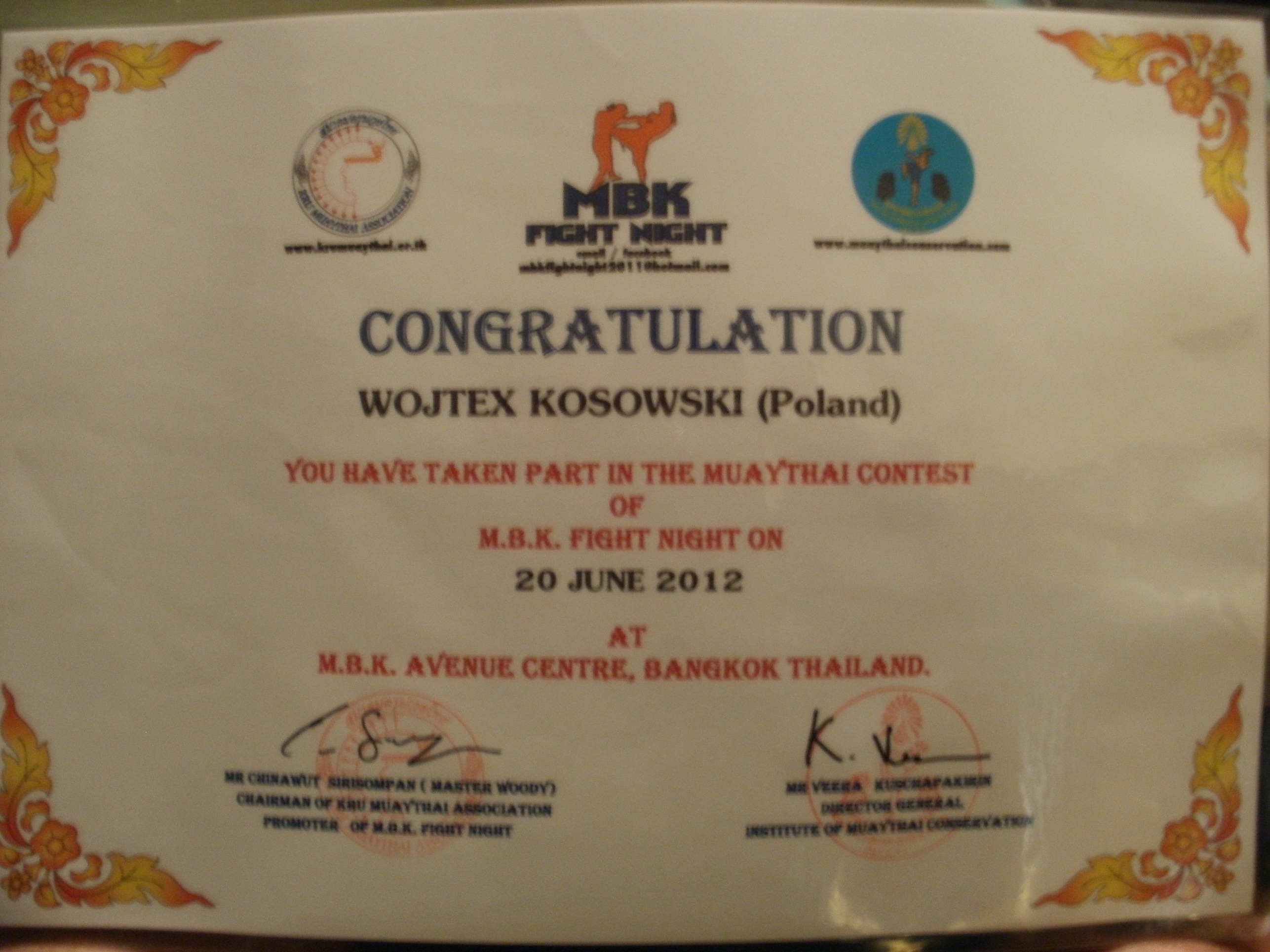 W środę 20 czerwca 2012-ego walczyłem zawodowo z Tajem Winainoi Ketapichart, na organizowanych cyklicznie galach przed centrum handlowym MBK w Bangkoku (MBK Fight Night). Propozycje walki dostałem dzień wcześniej, uznałem, że to dobra okazja i przygoda, choć nie byłem wystarczająco przygotowany kondycyjnie na walkę 5 rund po 3 min. W sumie nie byłem w ogóle przygotowany, bo byłem po okresie roztrenowania, ale ochoczo i spontanicznie przyjąłem walkę. W Tajlandii co prawda trenowałem, ale były o treningi bardziej techniczne, nie nastawione na przygotowanie do walki. Głównie zwiedzałem, opalałem się, poznawałem kulturę i kuchnię tego kraju.
