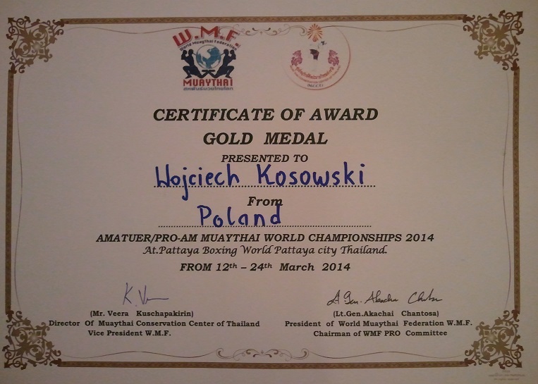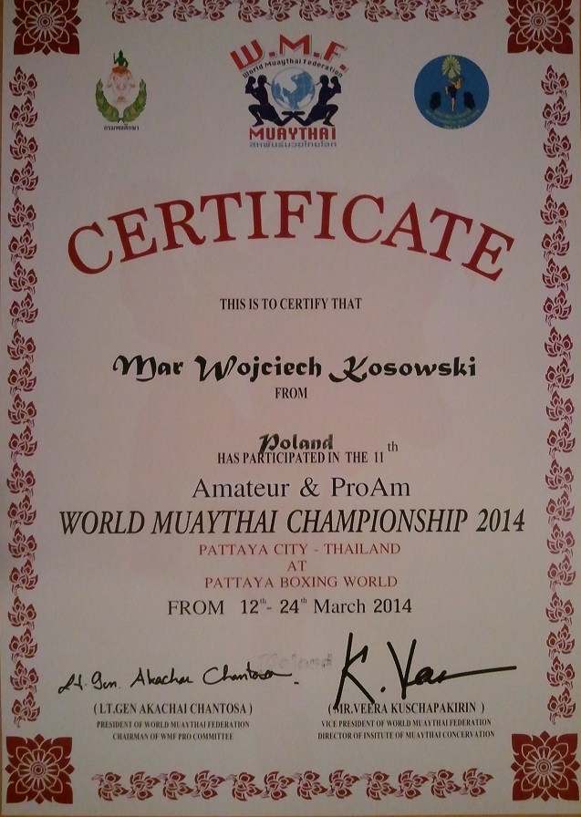 Miło mi poinformować, iż w tym roku zostałem Mistrzem Świata Muay Thai WMF ProAm. Jest to mój największy dotychczasowy sukces, na który złożyło się wiele lat treningu oraz wysiłku mojego i innych. Mistrzowski pas zdobyłem na odbytych w dniach 12-14 marca, w Pattayi w Tajlandii MŚ. Startowałem klasycznie w kategorii 71-75 kg.